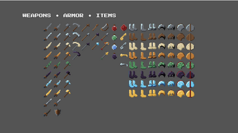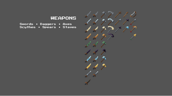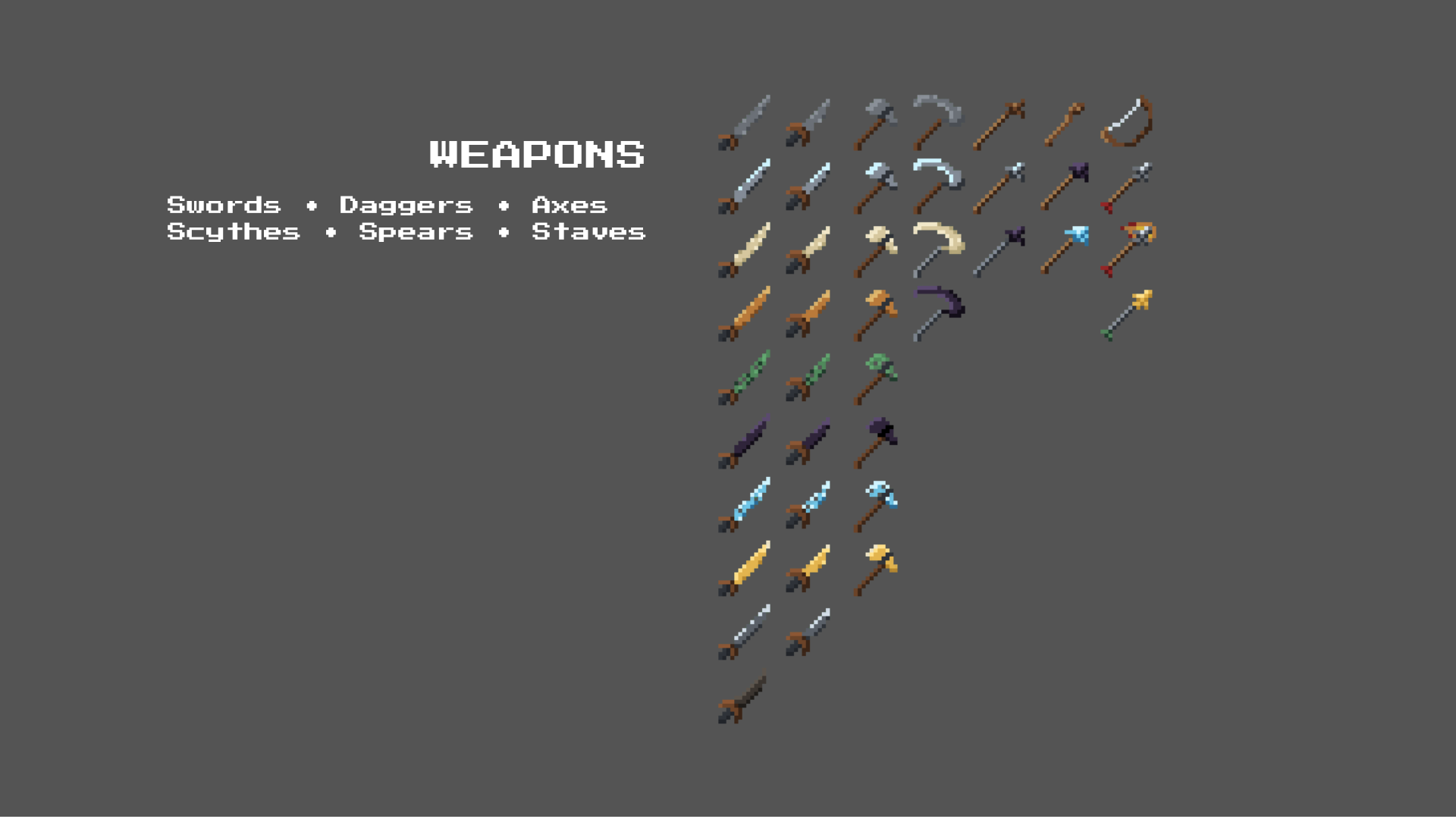 The pack includes over 100 hand-crafted sprites covering weapons, armor, items, and utilities, with multiple material variations such as stone, iron, bone, copper, gold, crystal, obsidian, and leaf. A bonus sword sprite is included.